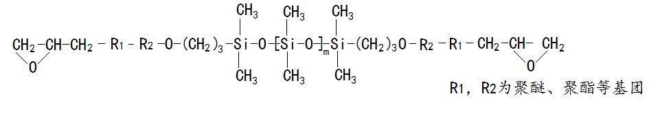 多元共聚環(huán)氧硅油分子結(jié)構(gòu)經(jīng)過(guò)特殊設(shè)計(jì),經(jīng)過(guò)特殊合成方法,使分子兩端具有環(huán)氧基團(tuán),主鏈上帶有聚氧乙烯醚、有機(jī)硅、聚酯、酰胺等基團(tuán),屬線性多元共聚而成的有機(jī)硅中間體。由于其具有環(huán)氧基團(tuán),可以和胺基類物質(zhì)進(jìn)行反應(yīng)。